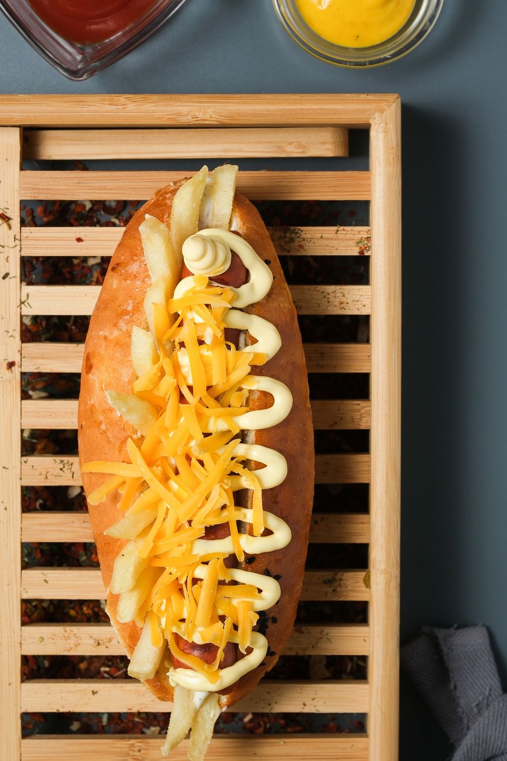 Баварская колбаска, соус Блю чиз, картофель фри, соус Сырный, сыр чеддер