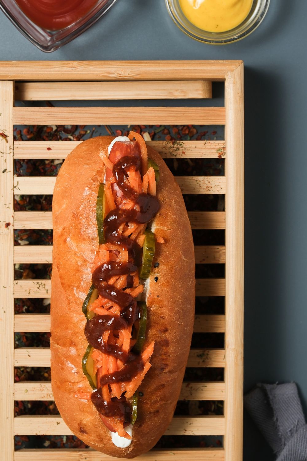 Баварская колбаска, майонез, огурец маринованный, корейская морковка, соус Спайси