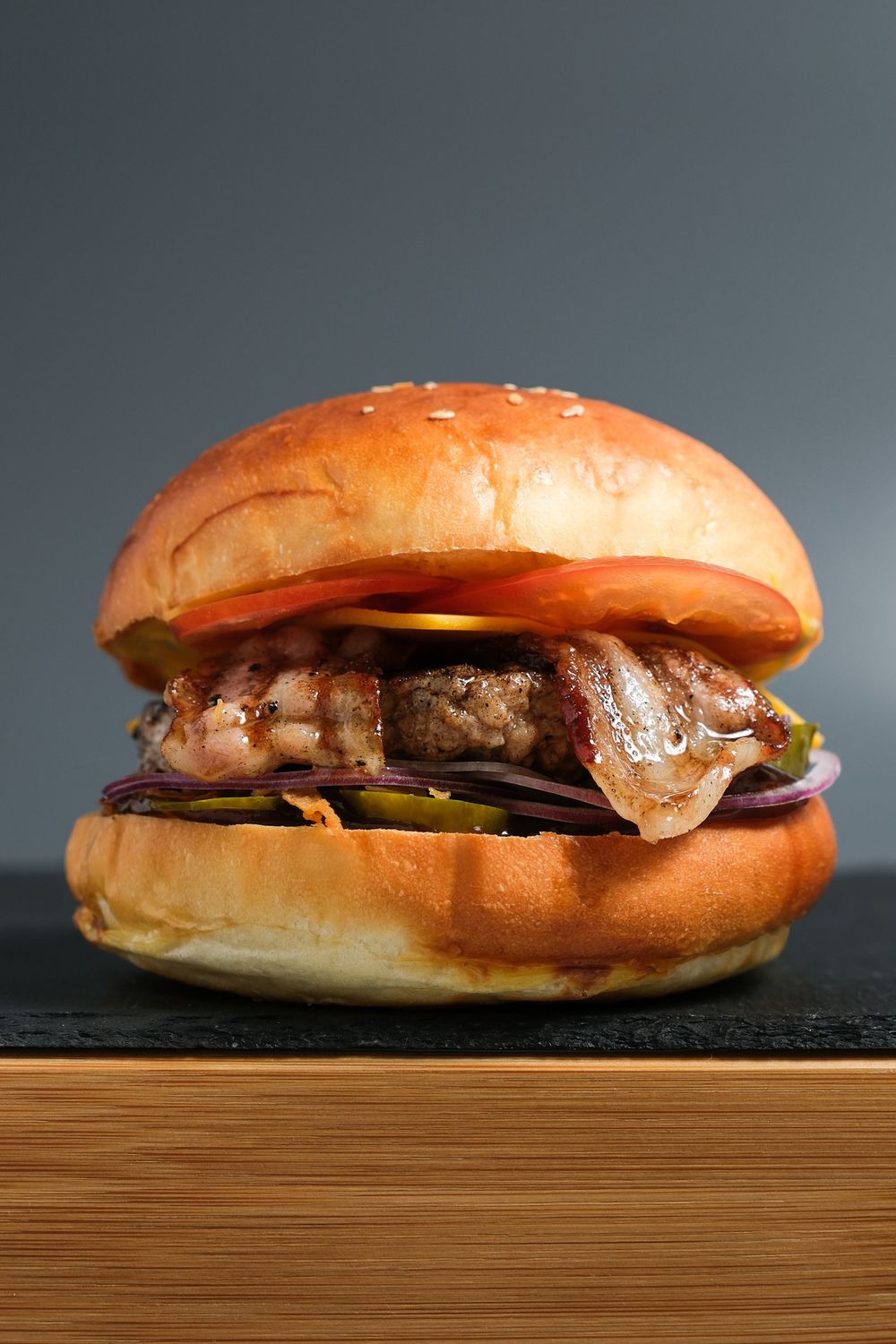 Горчичный соус, соус BBQ, свиная котлета гриль, красный лук, маринованные огурцы, сыр чеддер, помидор, бекон, жареный лук