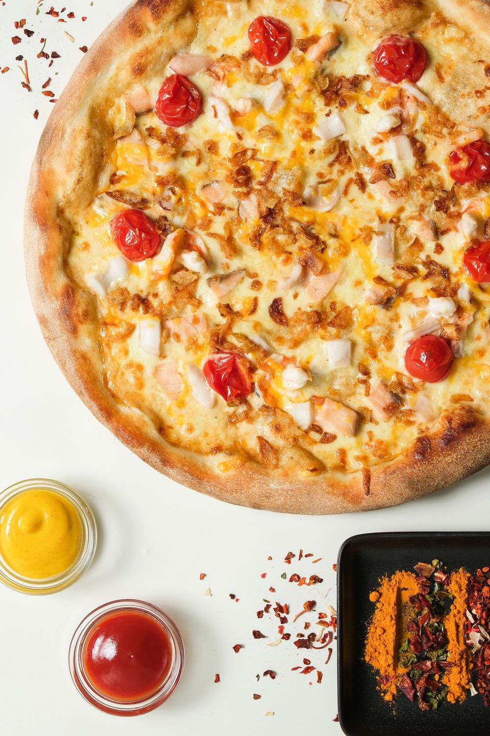 Соус сливочный, сыр Моцарелла, сыр Чеддер, лосось с/с, креветки королевские, кальмар, помидоры черри, жареный лук