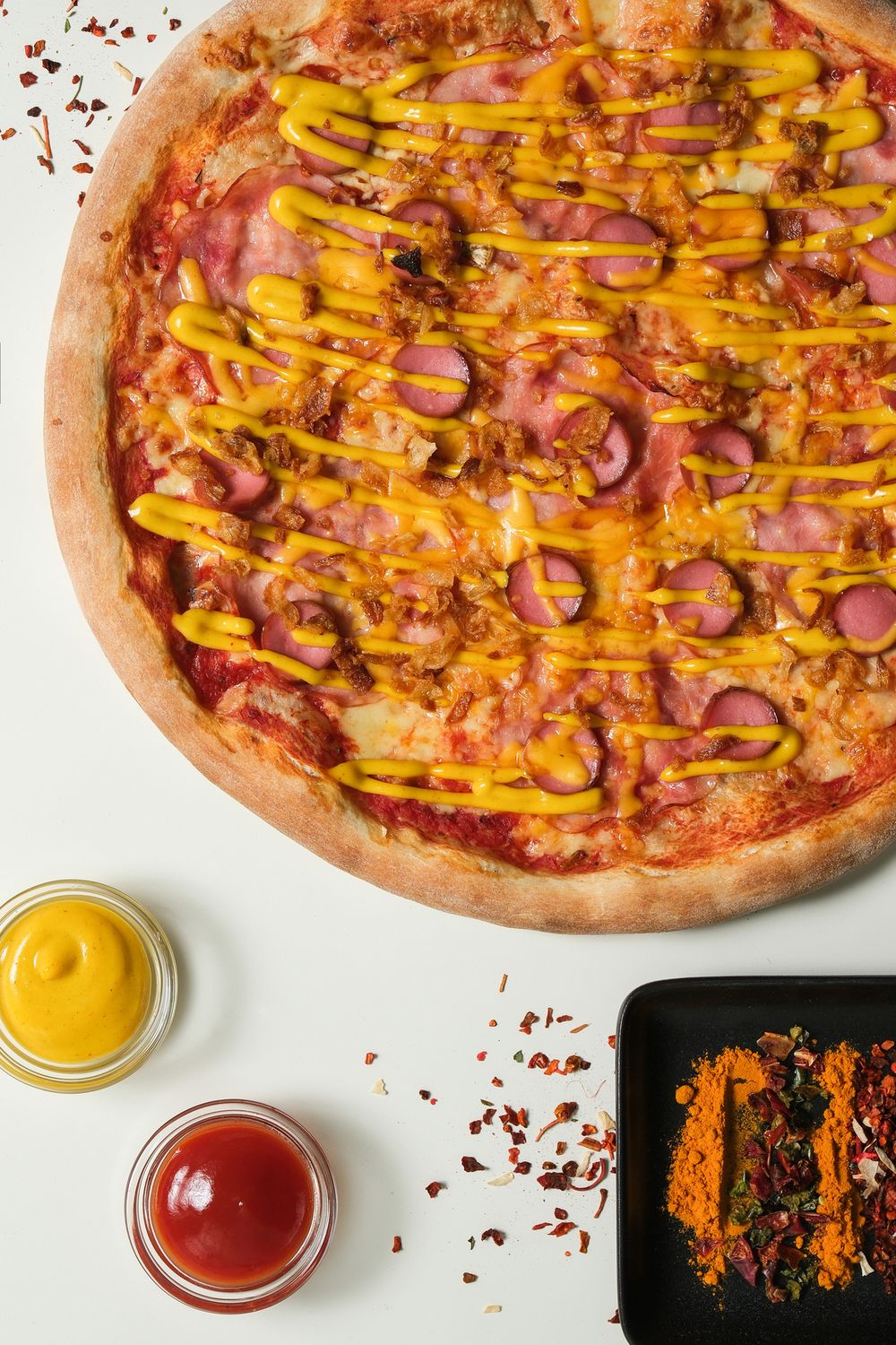Соус томатный, сыр Моцарелла, сыр Чеддер, ветчина, жареный лук, сосиски, соус Горчичный