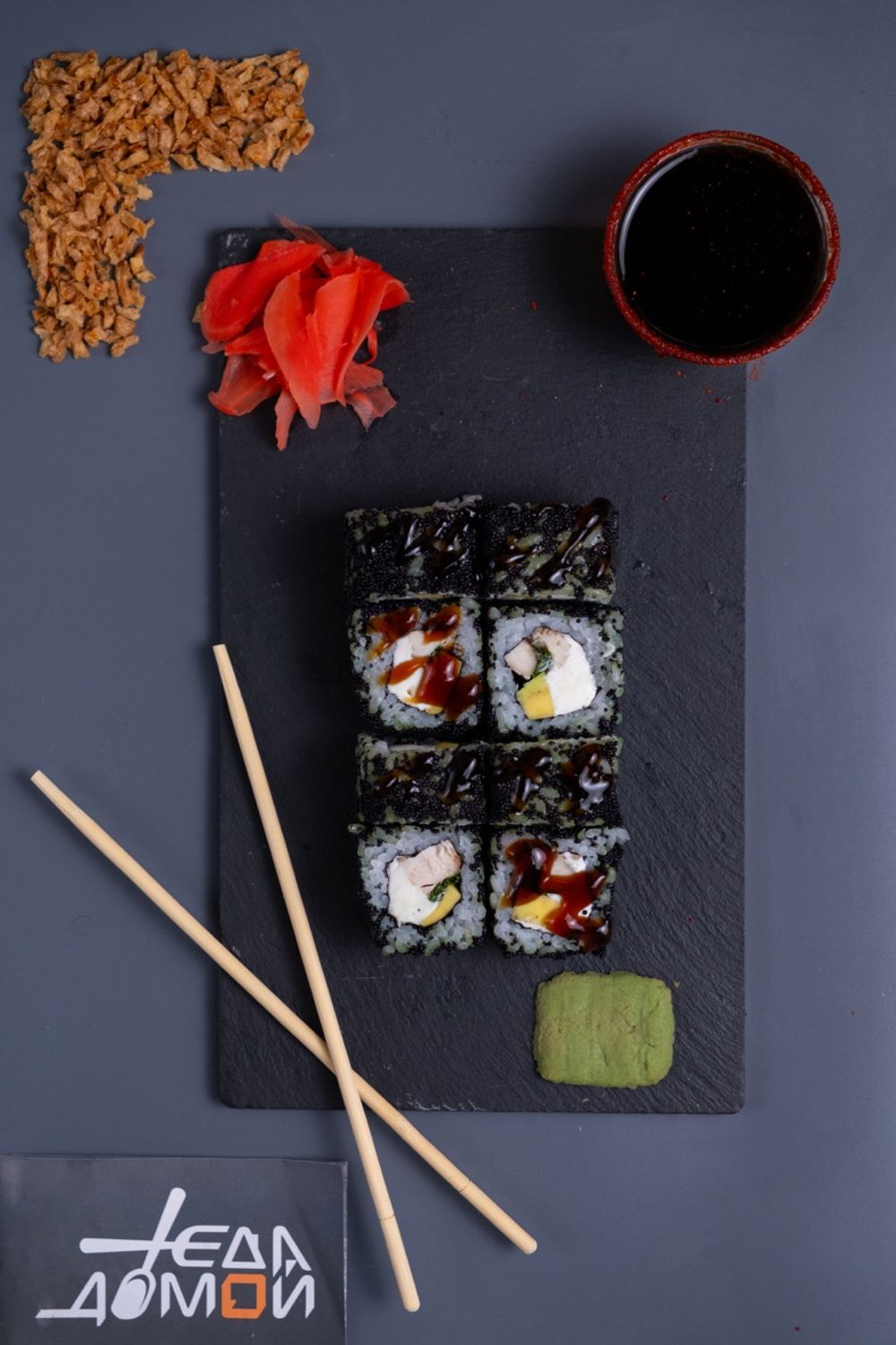 Рис, сыр сливочный, курица копченая, авокадо, тобико, соус Терияки
