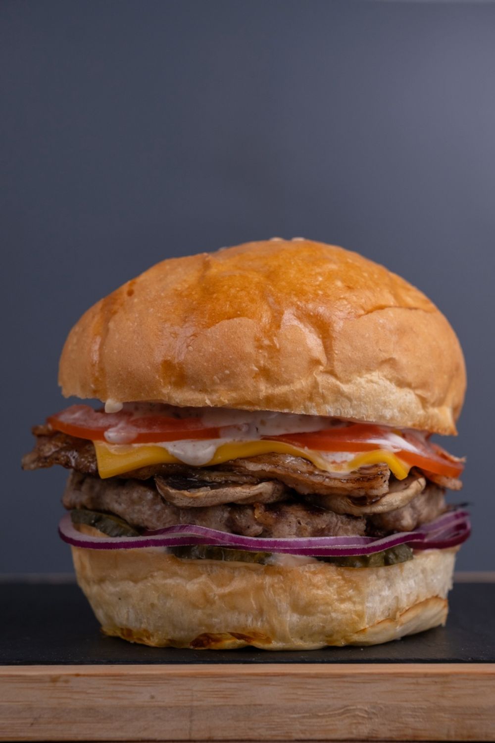 Соус Ранч, свинина, шампиньоны, бекон, лук красный, огурец маринованный, помидор, сыр чеддер
