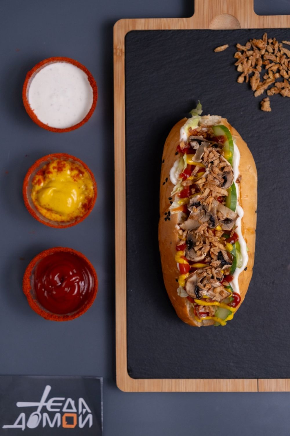 Сосиска, кетчуп, майонез, горчица, салат Айсберг, огурец,, помидор, шампиньоны, лук жаренный