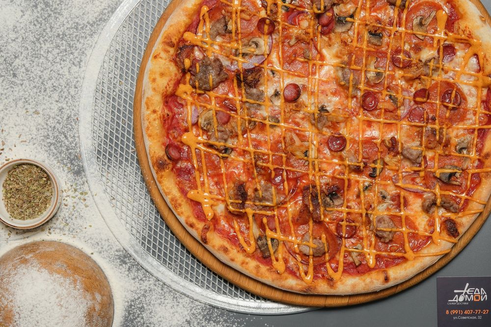 Соус томатный, сыр Моцарелла, баварские колбаски, курица, пепперони, шампиньоны, свинина, красный лук, соус Спайси
