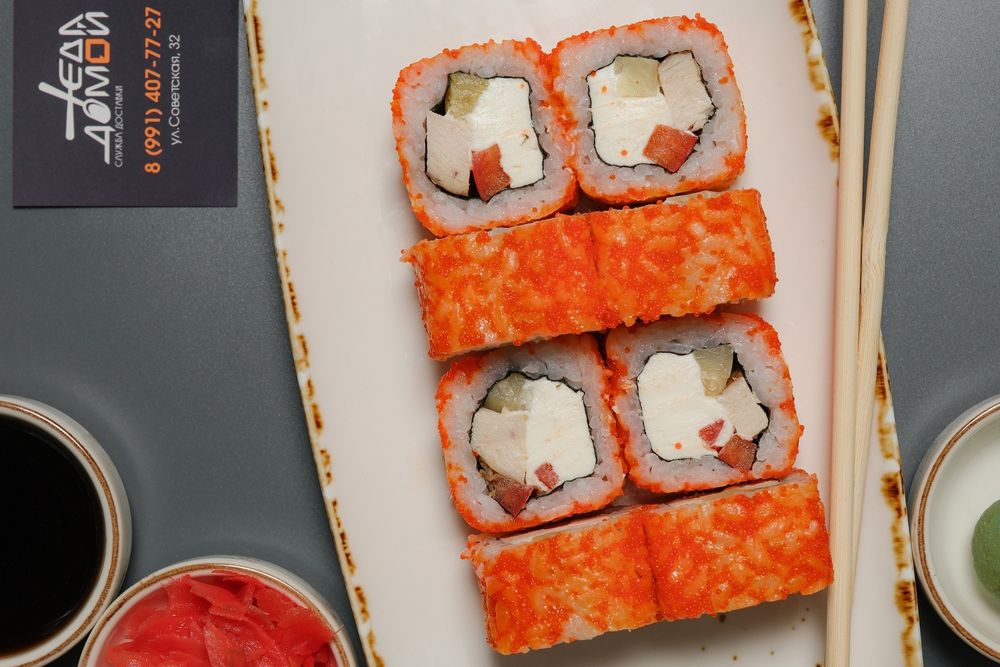 Нори, сыр творожный, икра Тобико, болгарский перец, курица копченая, ананас