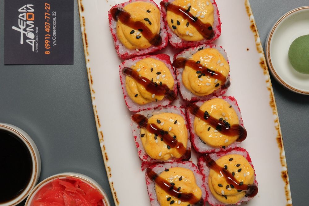 Нори, сыр творожный, яблоко, креветка королевская, салат, сырный соус, соус терияки, кунжут