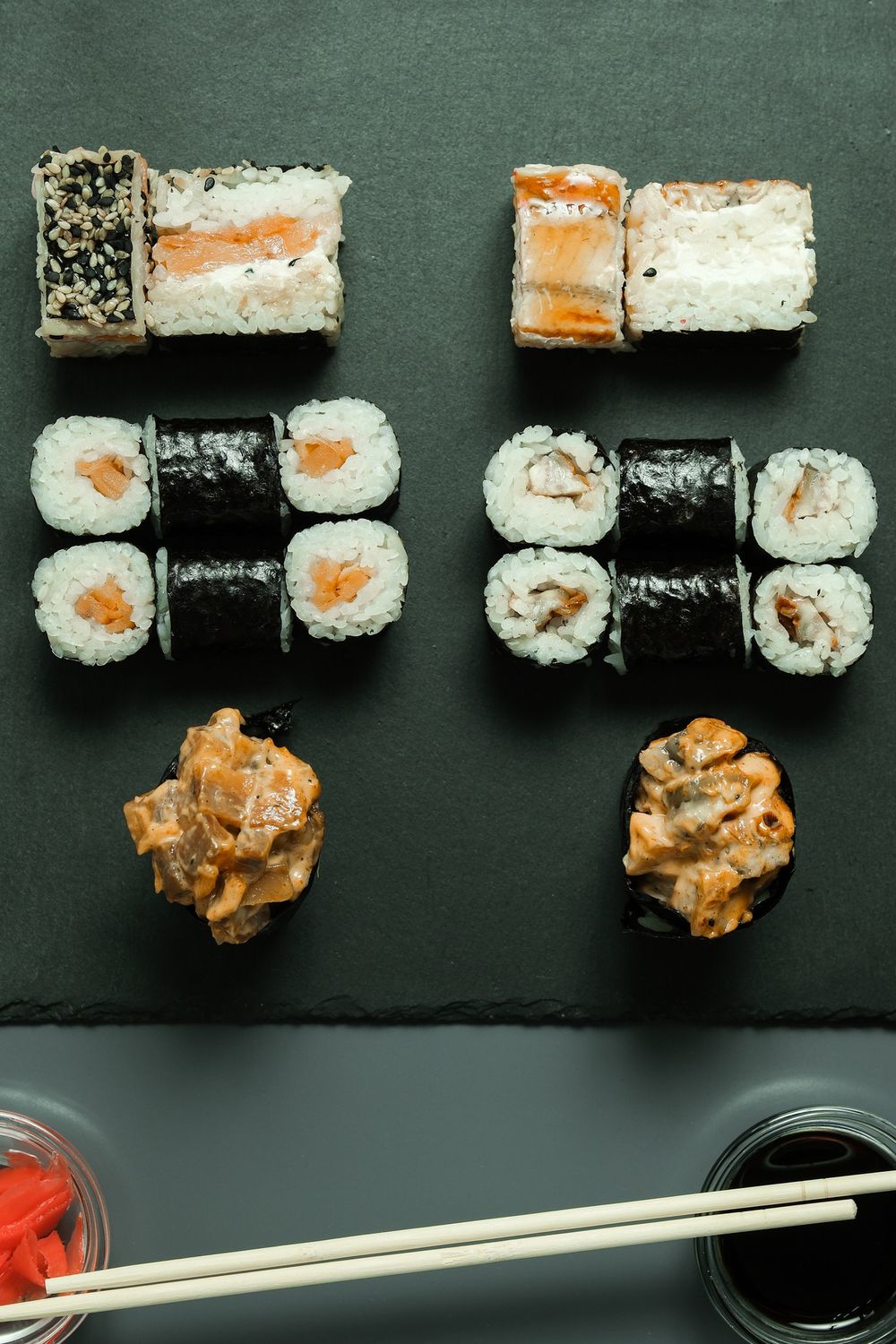 Ролл «Унаги маки», ролл «Сяке маки», ролл «Суши-кейк с угрём», ролл «Суши-кейк с сёмгой», Суши Спайси эби, Суши Спайси сяке