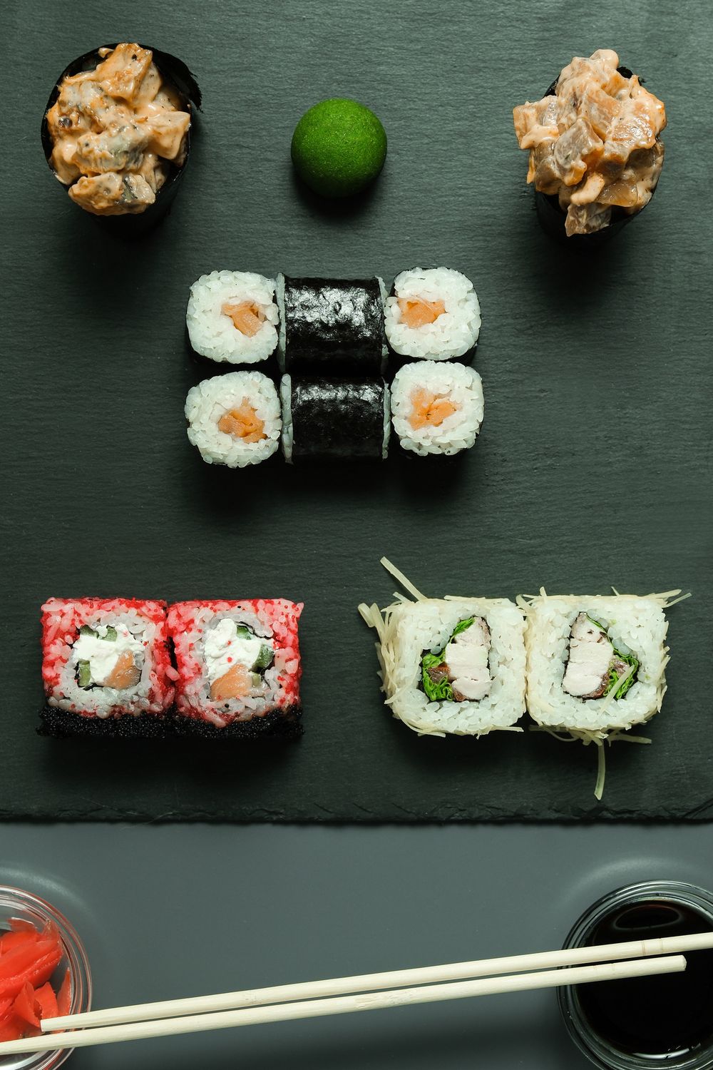 Ролл «Цезарь», ролл «Валенсия», суши «Спайси унаги» 1 шт, суши «Спайси сяке» 1 шт, ролл «сяке маки»