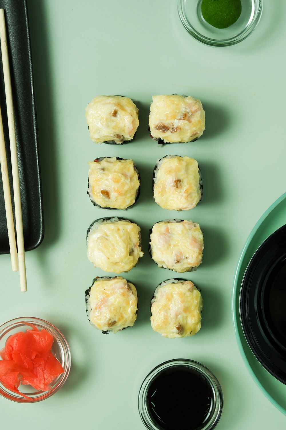 Рис, сыр сливочный,нори,авокадо, с/с семга, имбирь, майонез, пармезан