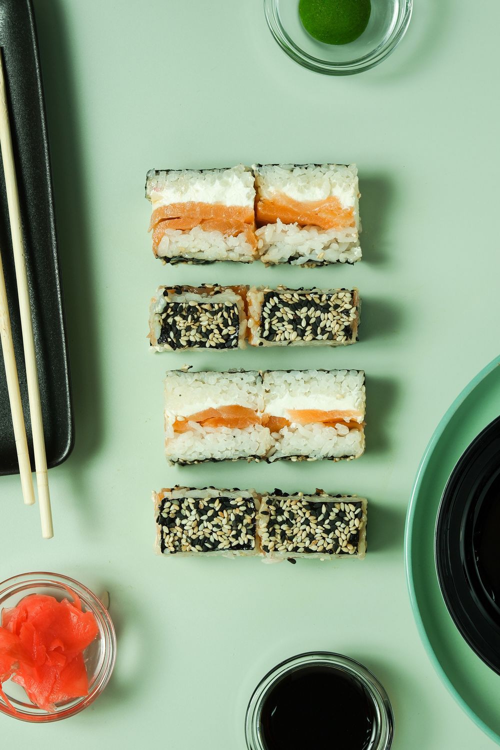 Рис, сыр сливочный, с/с семга ,соус унаги, кунжут