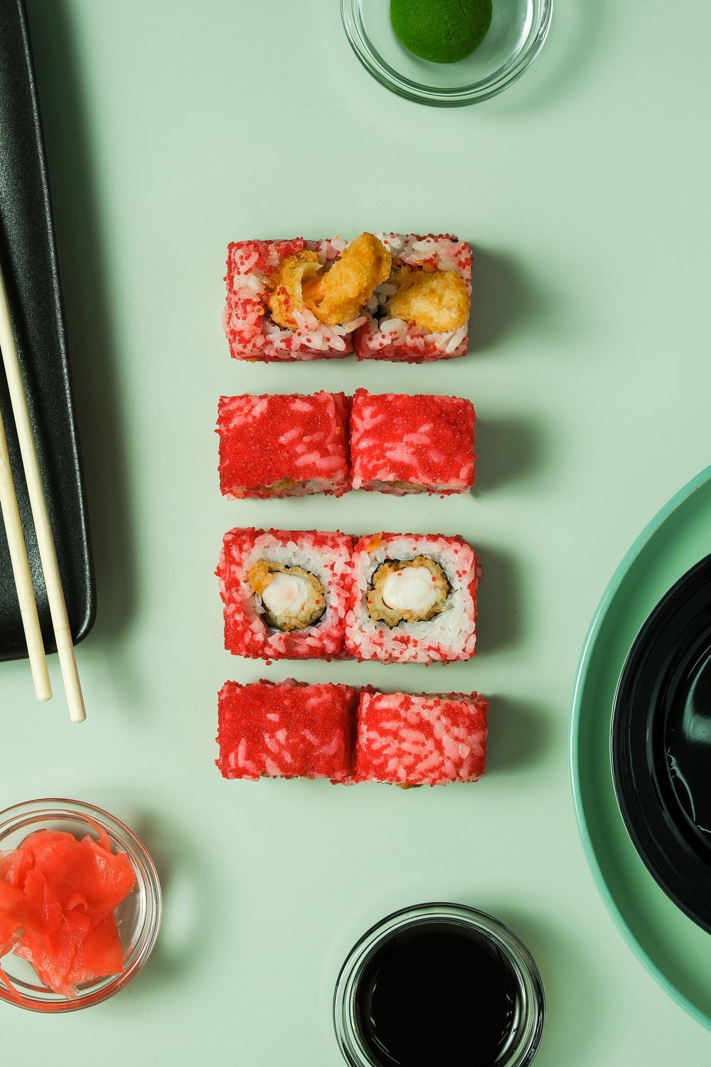 Рис, икра тобики красная, креветки обжаренные в кляре, соус спайси