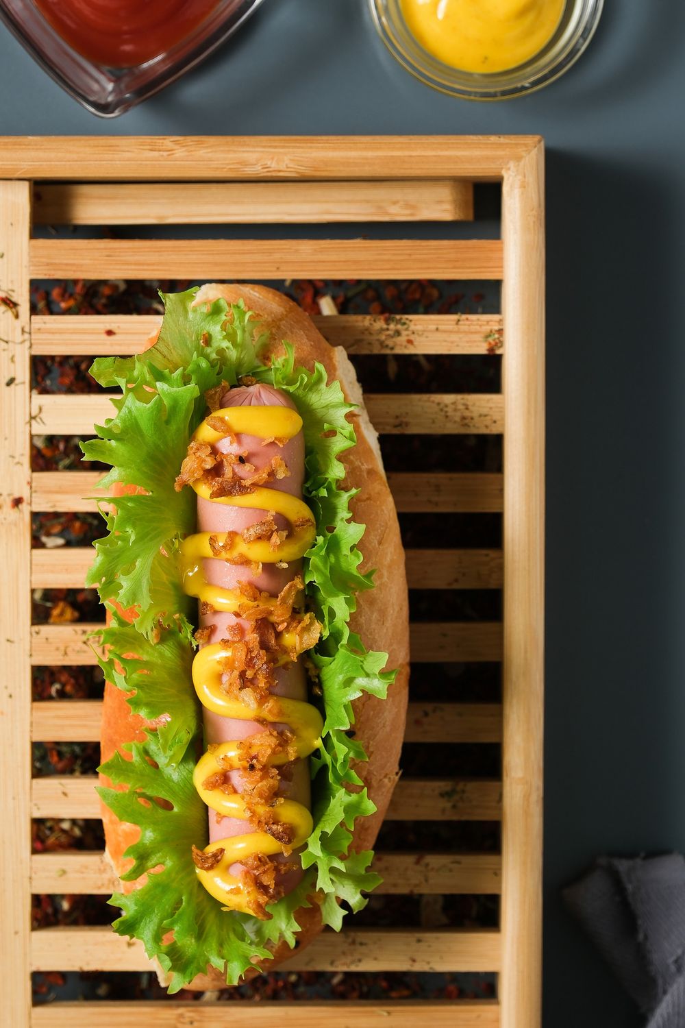 Айсберг, сосиска, соус Тар-тар, горчица, жареный лук
