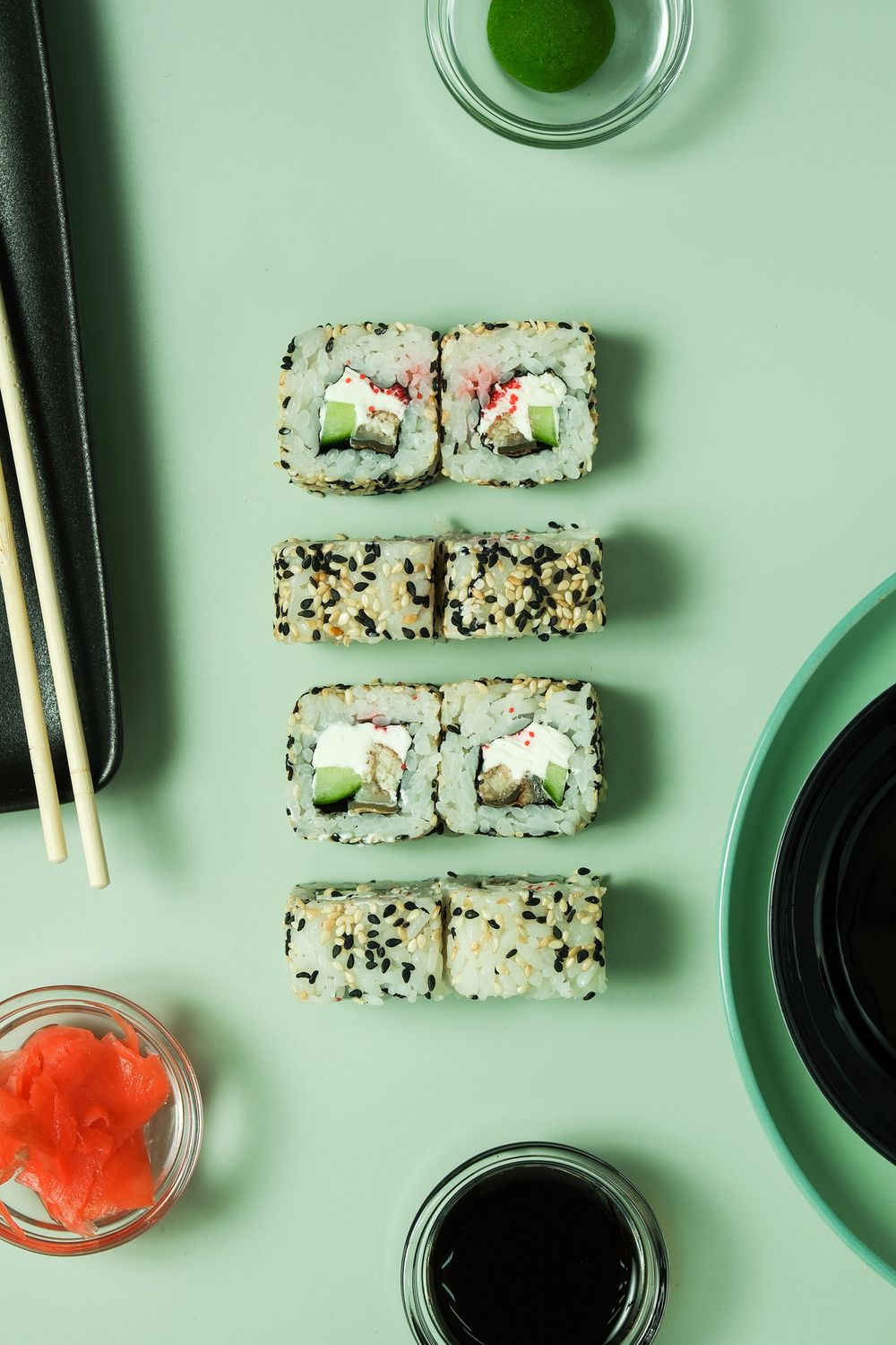 Рис, сыр сливочный, угорь копченый, огурец, кунжут, икра тобики красная