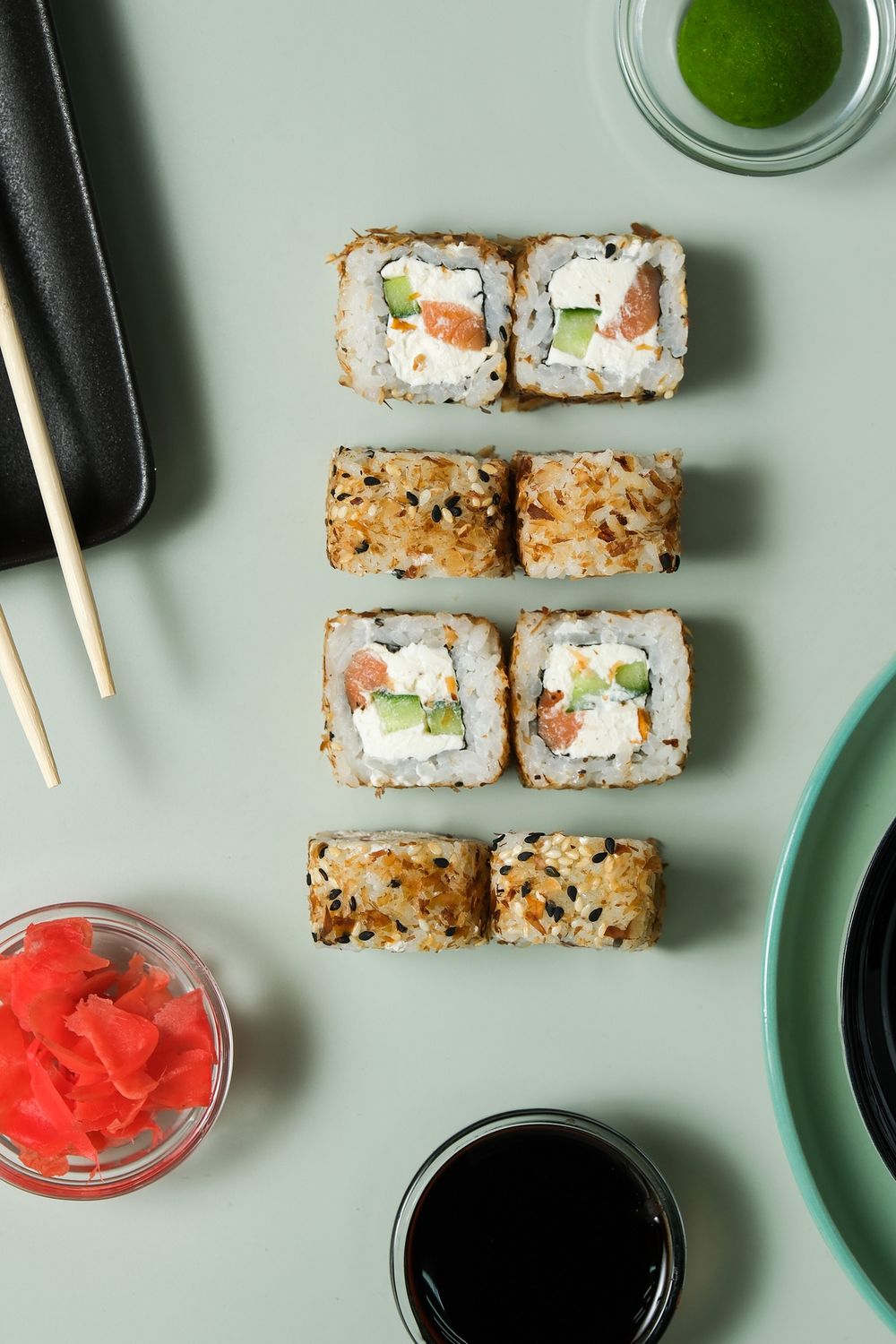 Рис, сыр сливочный, огурец, кунжут, лосось копченый, стружка тунца