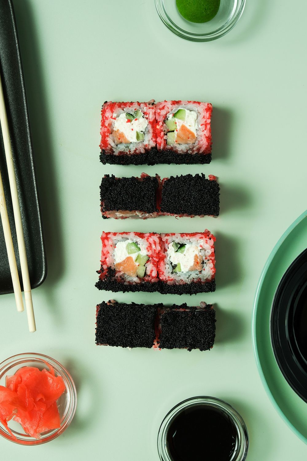 Рис, икра тобико красная и черная, огурец, сыр сливочный, копченый лосось