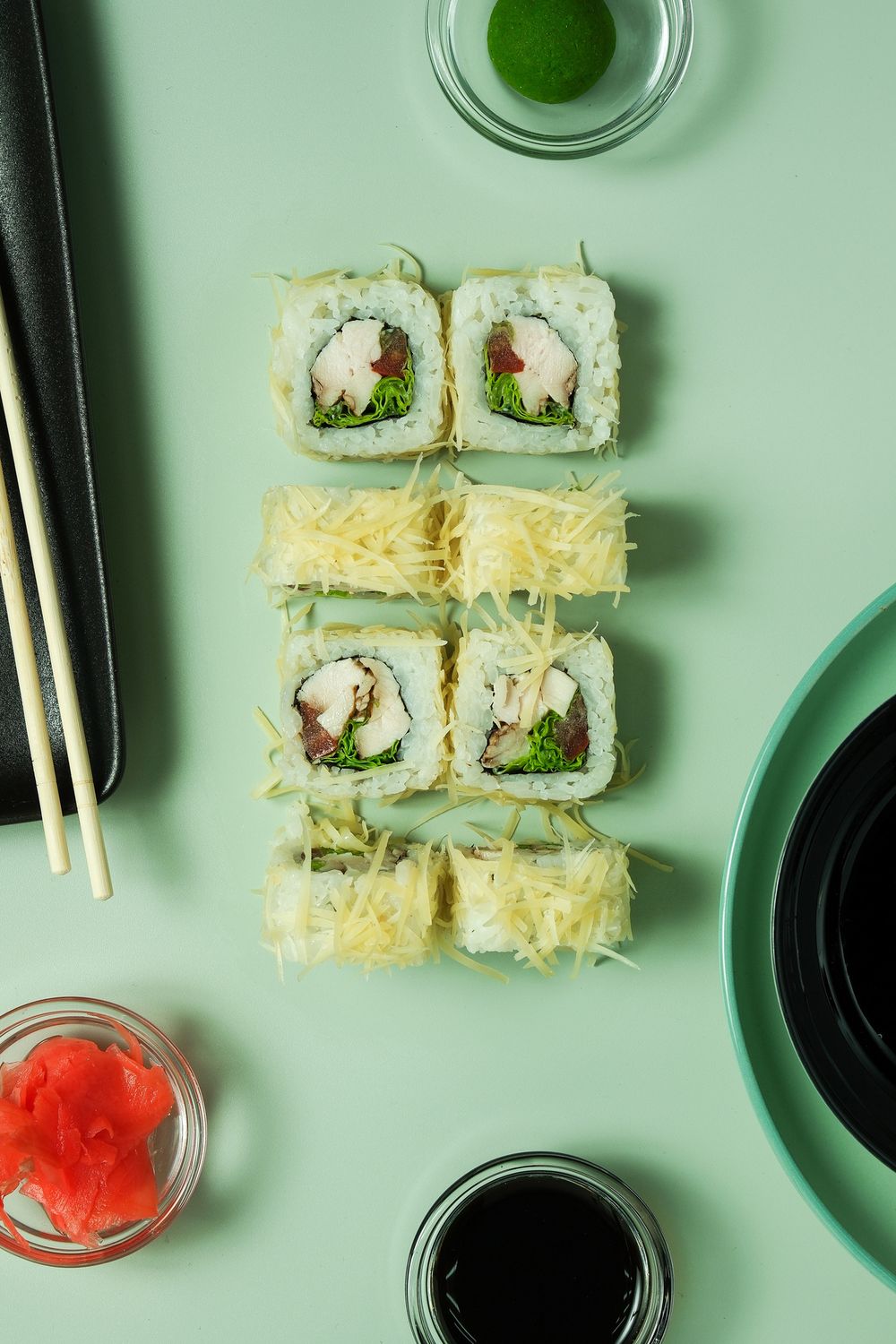 Рис, филе курицы, соус цезарь, лист салата, сыр пармезан