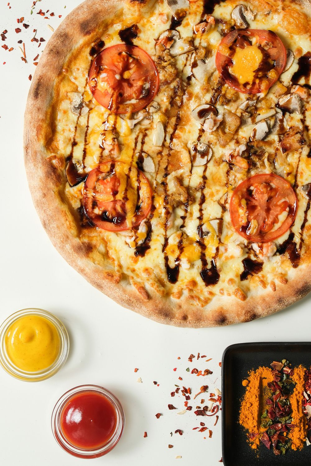 Соус сливочно-кокосовый,том-ям, сыр моцарелла, креветки королевские, курица, грибы, помидоры свежие, сыр чеддер, бальзамический крем-соус