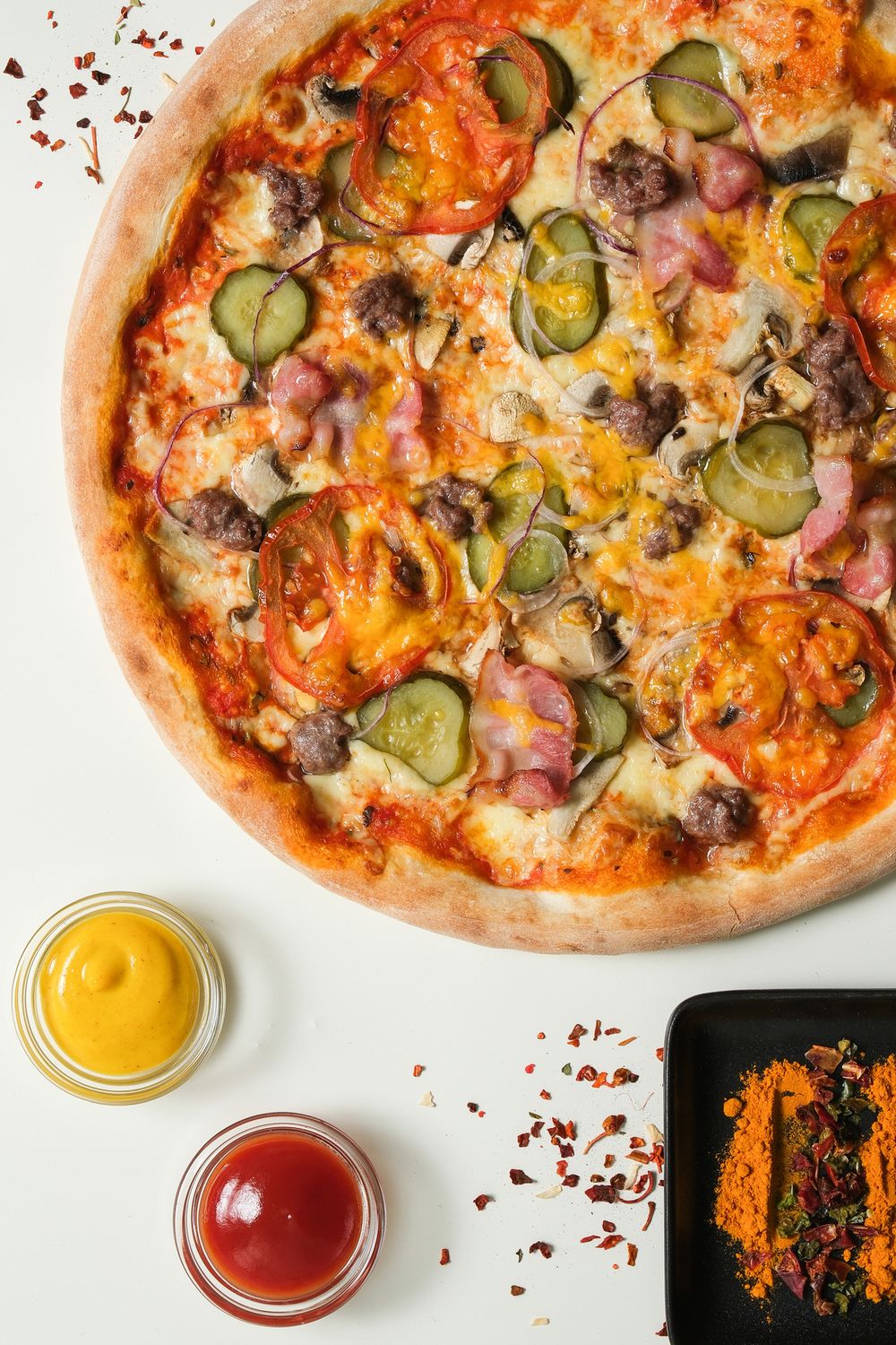 Соус томатный, соус тар-тар, сыр моцарелла, бекон, шампиньоны, фарш мраморной говядины, помидоры свежие, лук, огурцы маринованные, сыр чеддер
