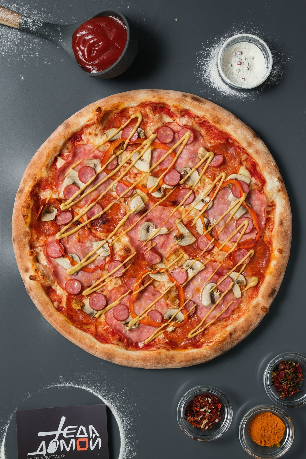 Соус томатный, сыр моцарелла, шампиньоны, перец болгарский, колбаса пеперони, колбаски баварские, ветчина, дижонская горчица