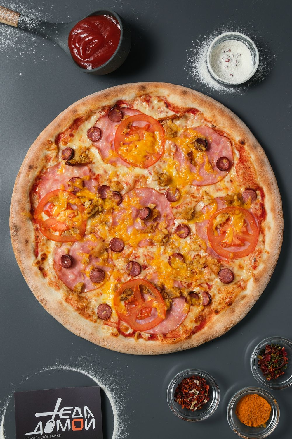 Соус томатный, сыр моцарелла,ветчина, колбаски баварские, сыр чеддер, курица, свежие помидоры