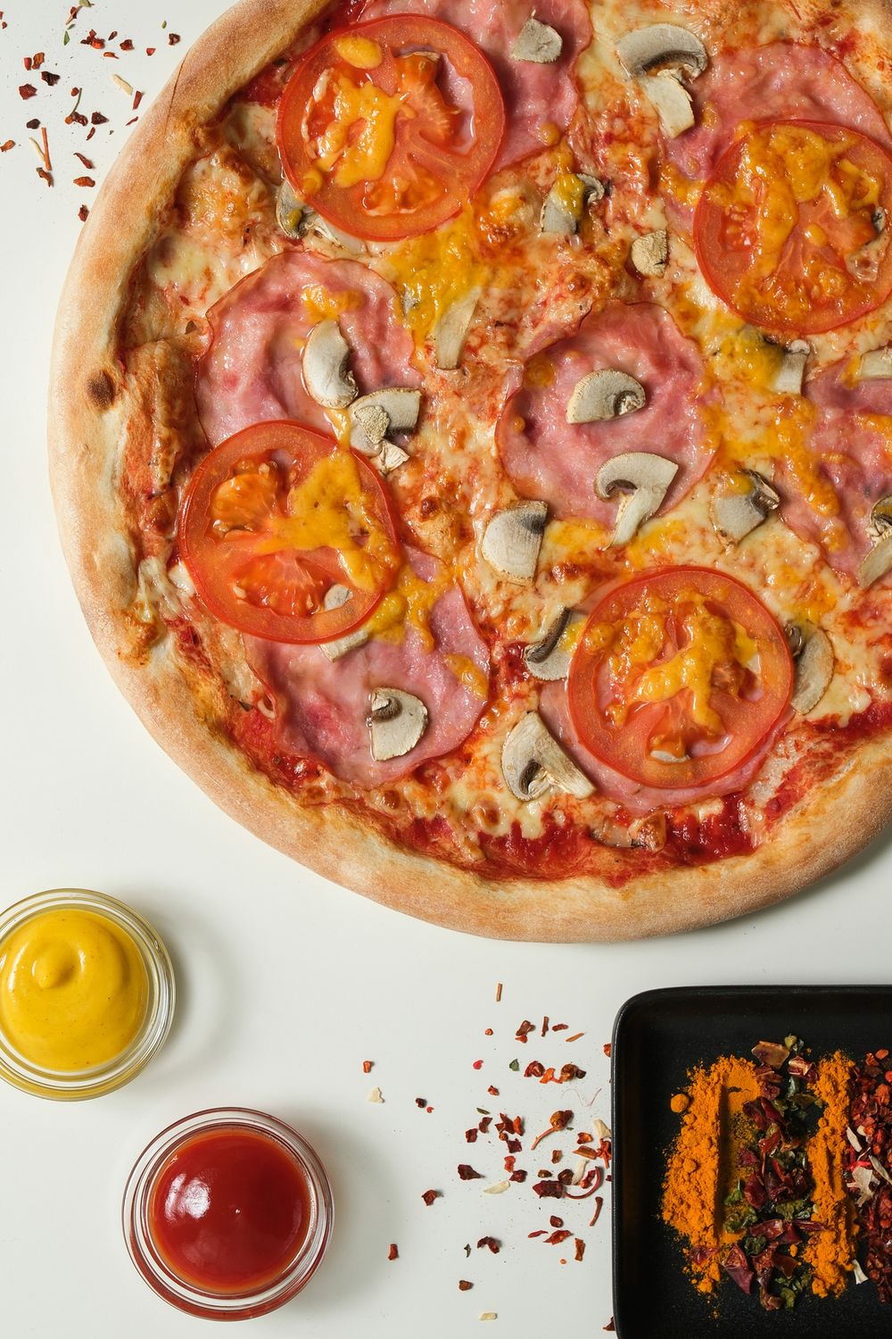 Соус томатный, сыр моцарелла, шампиньоны, ветчина, сыр чеддер, свежие помидоры