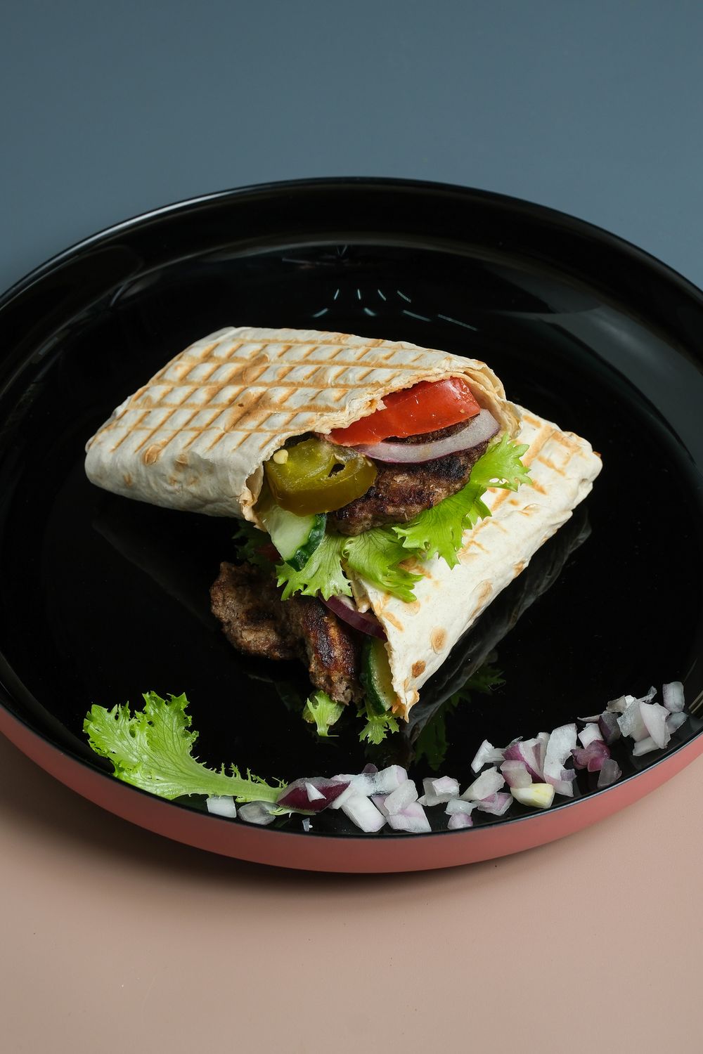 Лаваш, рубленая говядина Black Angus, капуста свежая, помидор свежий, огурец свежий, соус