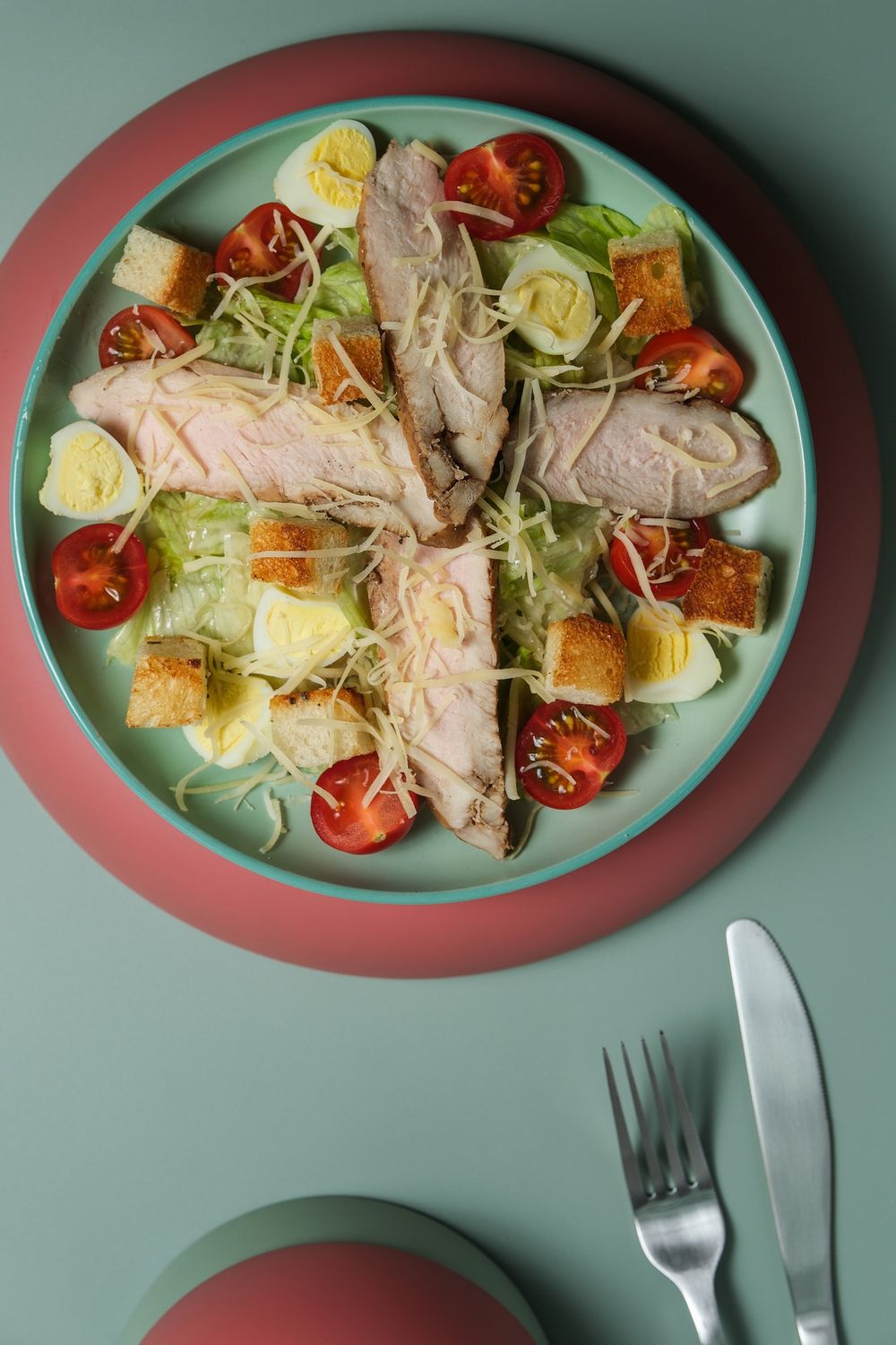 Салат айсберг, свежие помидоры, гренки, сыр пармезан, перепелиные яйца, куриная грудка