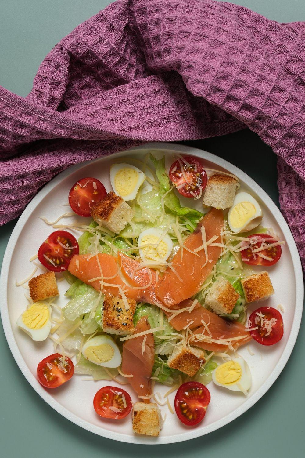 Салат айсберг, свежий помидор, гренки, сыр пармезан, перепелиное яйцо, сёмга с/с