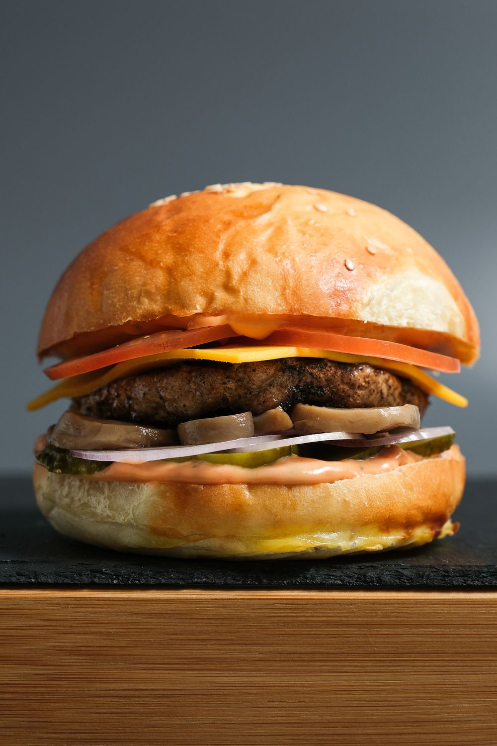 Фирменный соус, свиная котлета гриль, красный лук, маринованные огурцы, сыр чеддер, помидор, шампиньоны