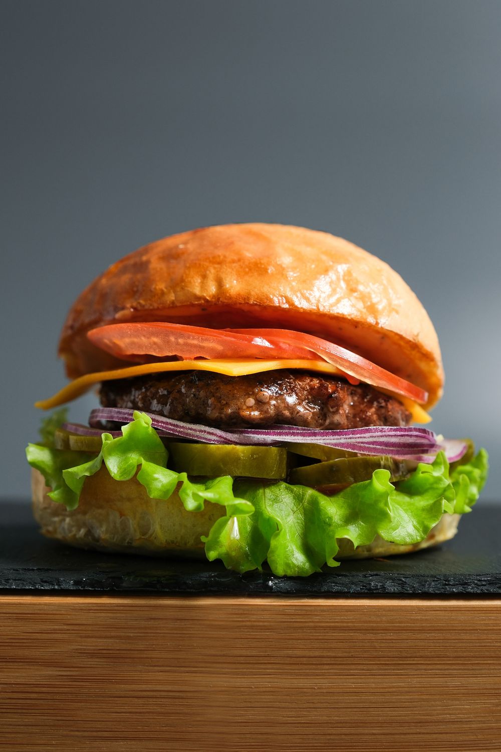 Соус фирменный, котлета гриль из мраморной говядины, красный лук, лист салата, маринованные огурцы, сыр чеддер, помидор свежий