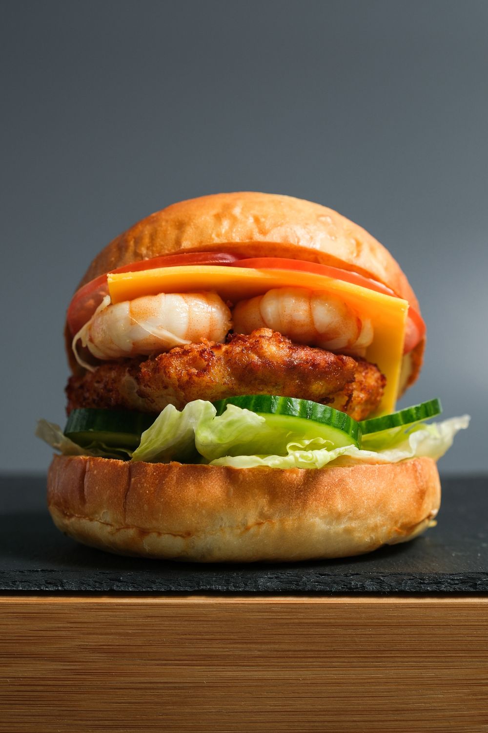 Куриная котлета в панировке, креветки королевские, соус том-ям, айсберг, огурец свежий, помидор свежий, сыр чеддер